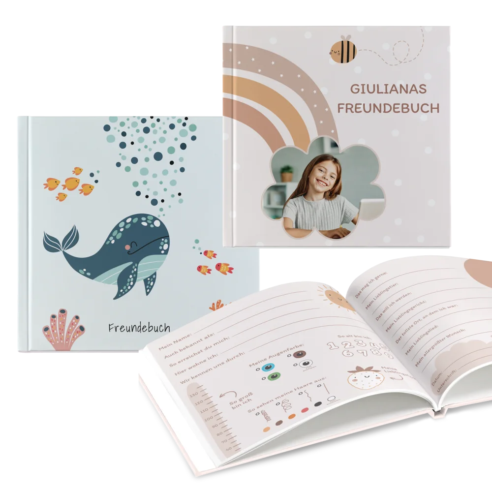 Das Freundebuch ist der ideale Begleiter für Kinder bis 10 Jahre, um Erinnerungen an Freunde aus Kindergarten und Schule festzuhalten – perfekt für kleine Künstlerinnen und Künstler. Das Buch lässt sich individuell gestalten, mit eigenem Foto und Titel auf dem Cover. Dank der vorgedruckten Steckbriefe ist es kinderleicht, die beschreibbaren Seiten auszufüllen. Zusätzlich gibt es Platzhalter für ein Foto des jeweiligen Freundes auf jeder Seite.