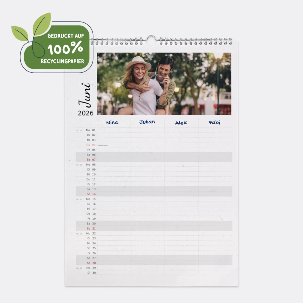 Wenn Sie Wert auf Übersicht und Nachhaltigkeit legen, ist der Natur Pur Familienkalender A3 hoch die ideale Wahl für Ihre Familie. Mit seinem großzügigen Format bietet er ausreichend Platz, damit jedes Familienmitglied eine eigene Spalte für Termine, Geburtstage und Aktivitäten erhält.