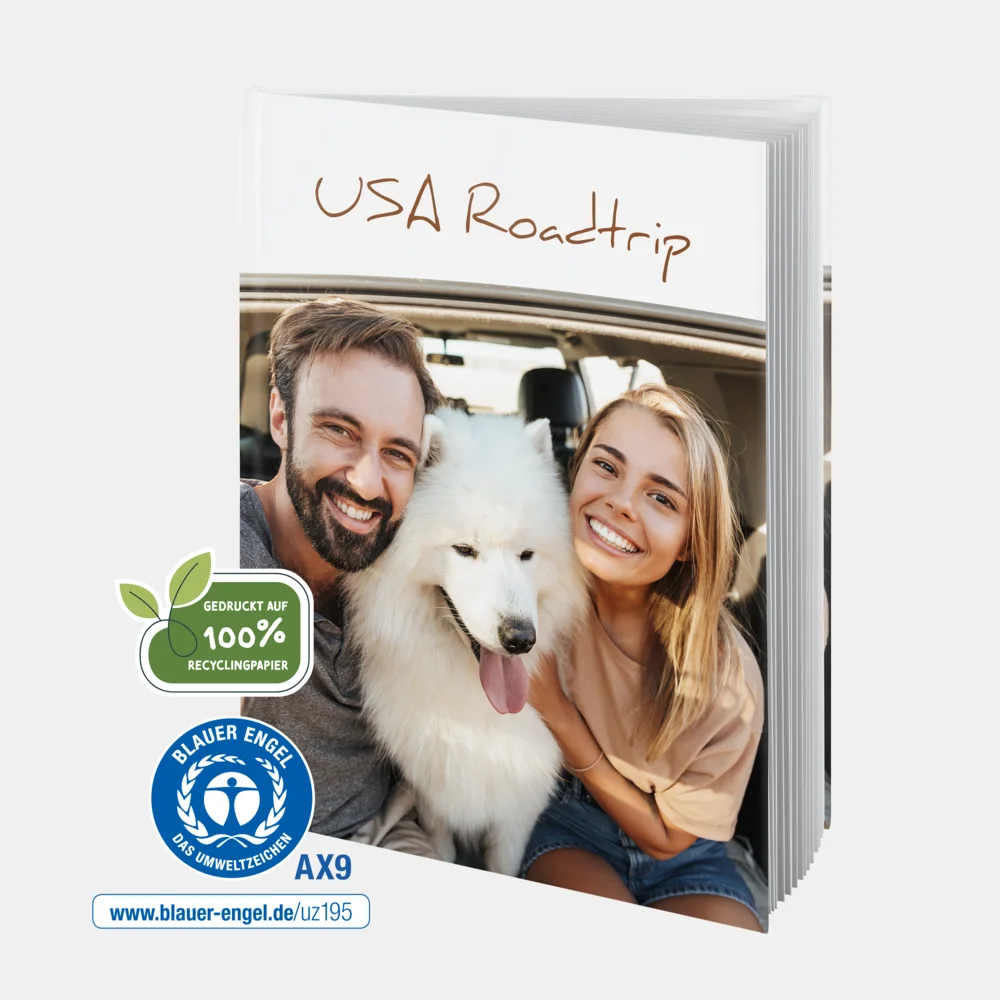 Die Seiten des Natur Pur Fotobuch® bestehen zu 100% aus Blauer Engel zertifiziertem Recyclingpapier.