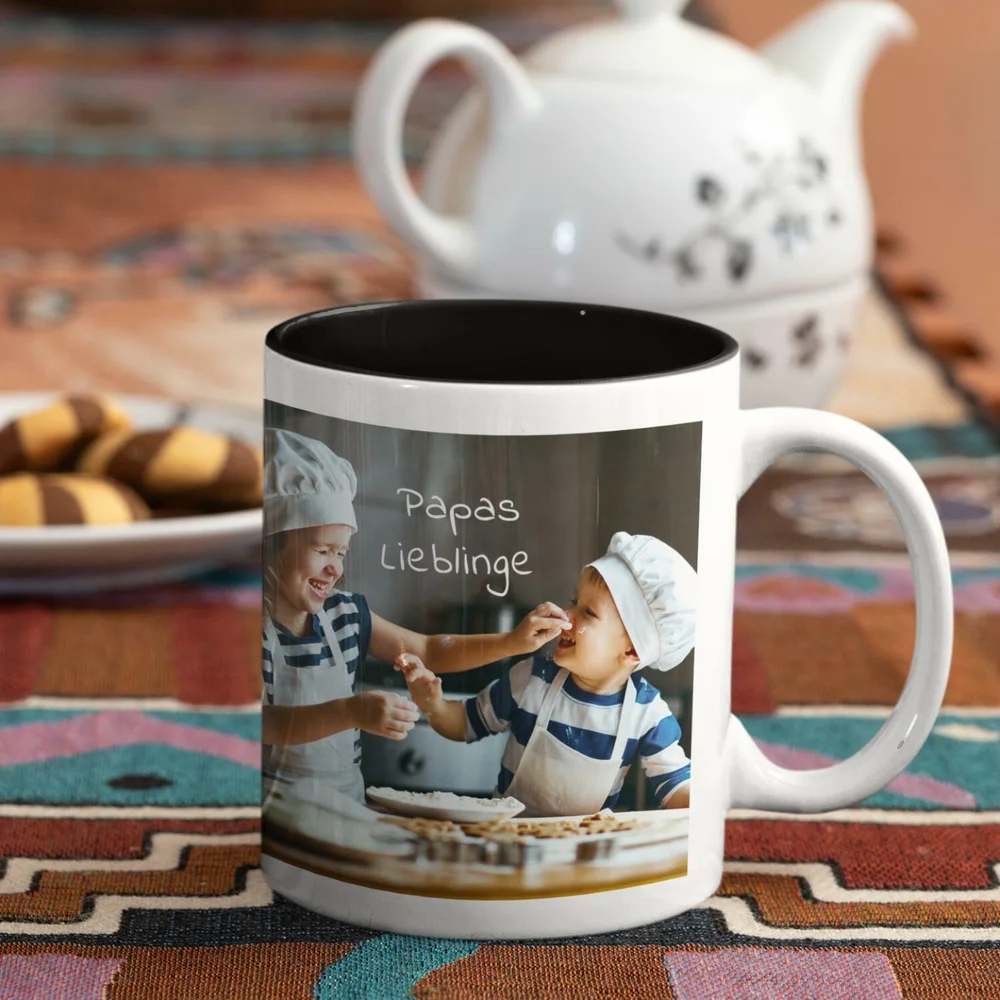 - Fototasse innen farbig: eine weiße Keramiktasse mit bunter Überraschung. Sie können Tassenrand und Innenseite mit einer leuchtenden Farbe gestalten. Wählen Sie aus zehn Möglichkeiten Ihre Lieblingsfarbe! Sehr praktisch, wenn Sie ein ganzes Service zusammenstellen und die Tassen individualisieren wollen.